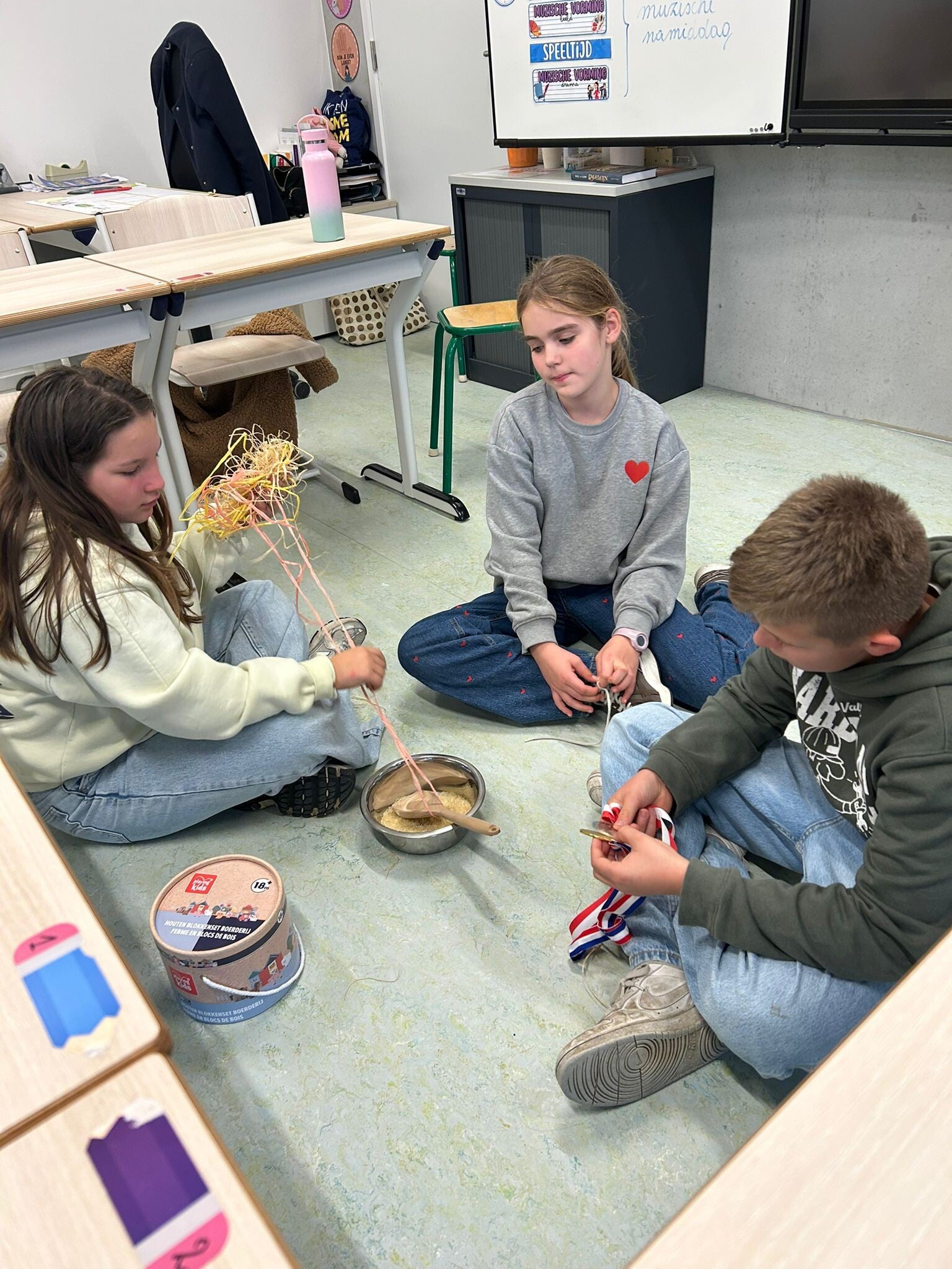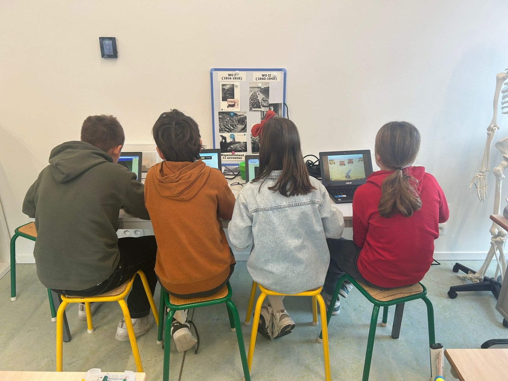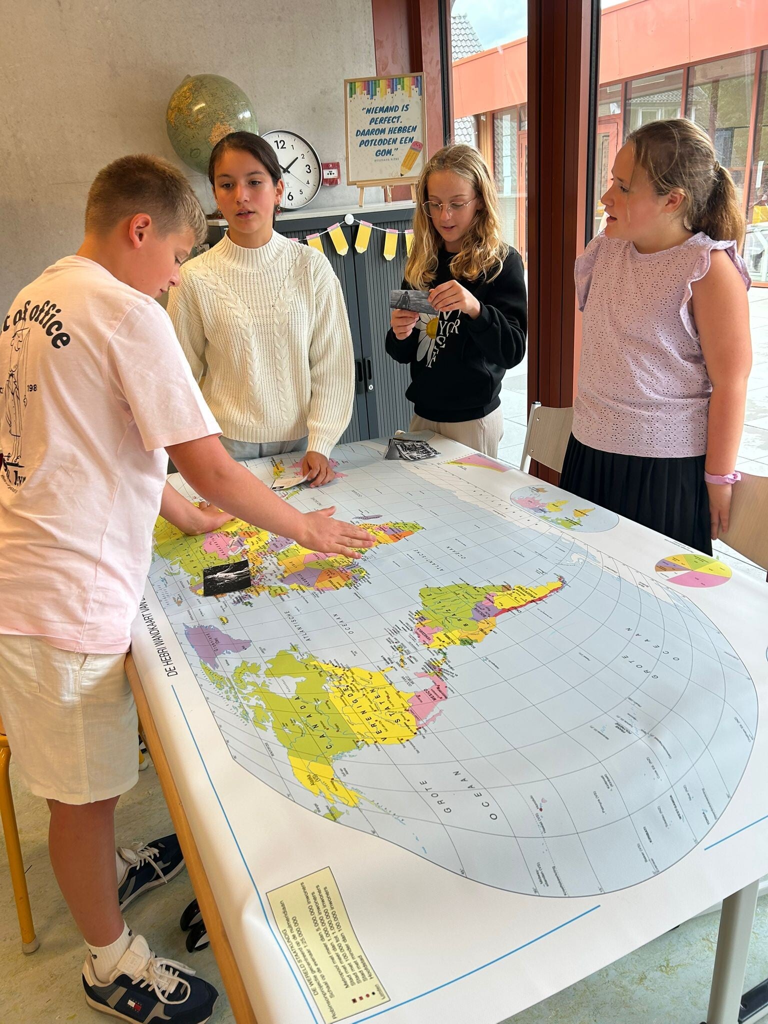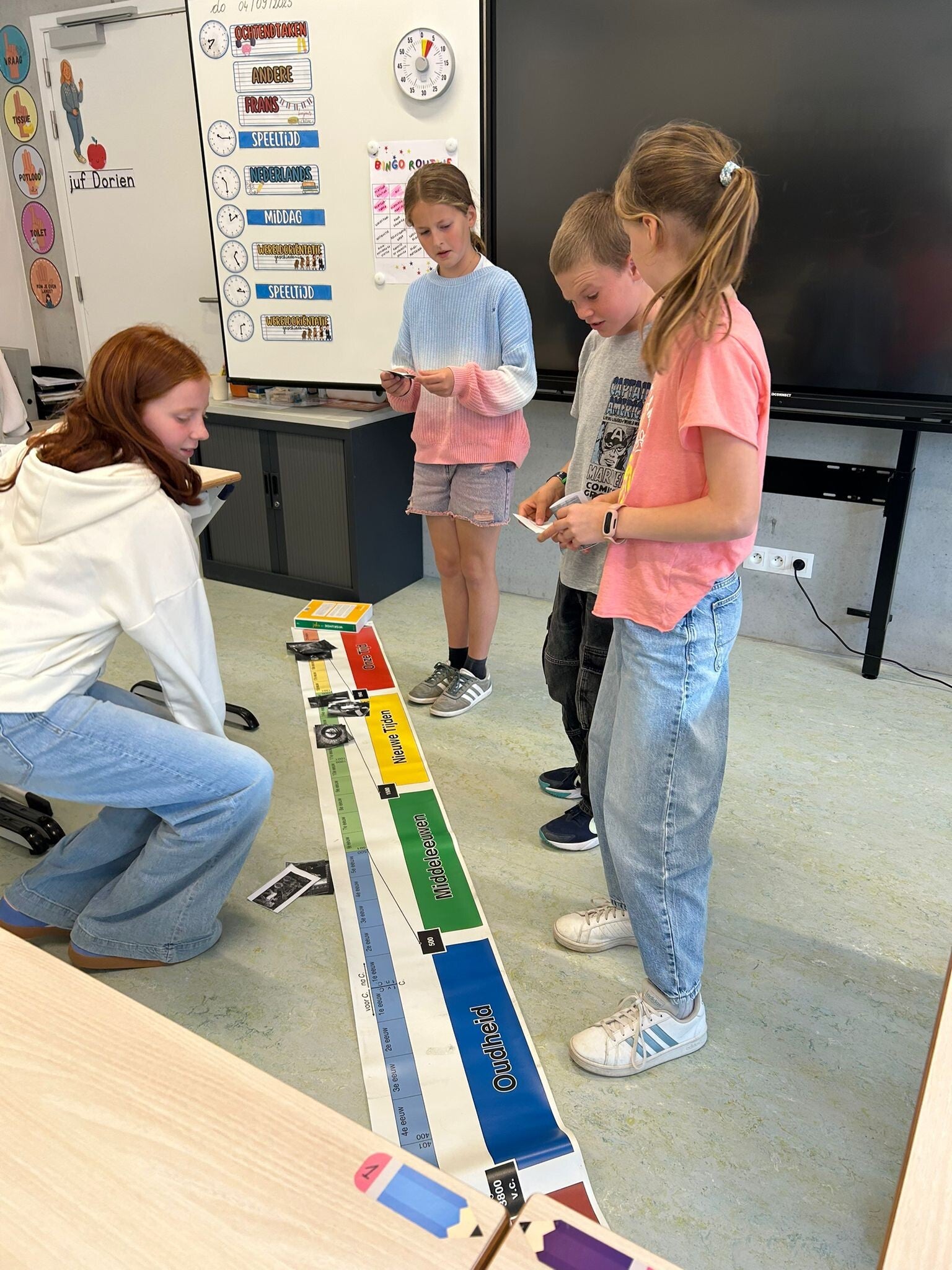 De eeuwenband en wereldkaart hangt nog niet aan de muur in onze nieuwe klas. Perfect om er eerst nog mee aan de slag te gaan.